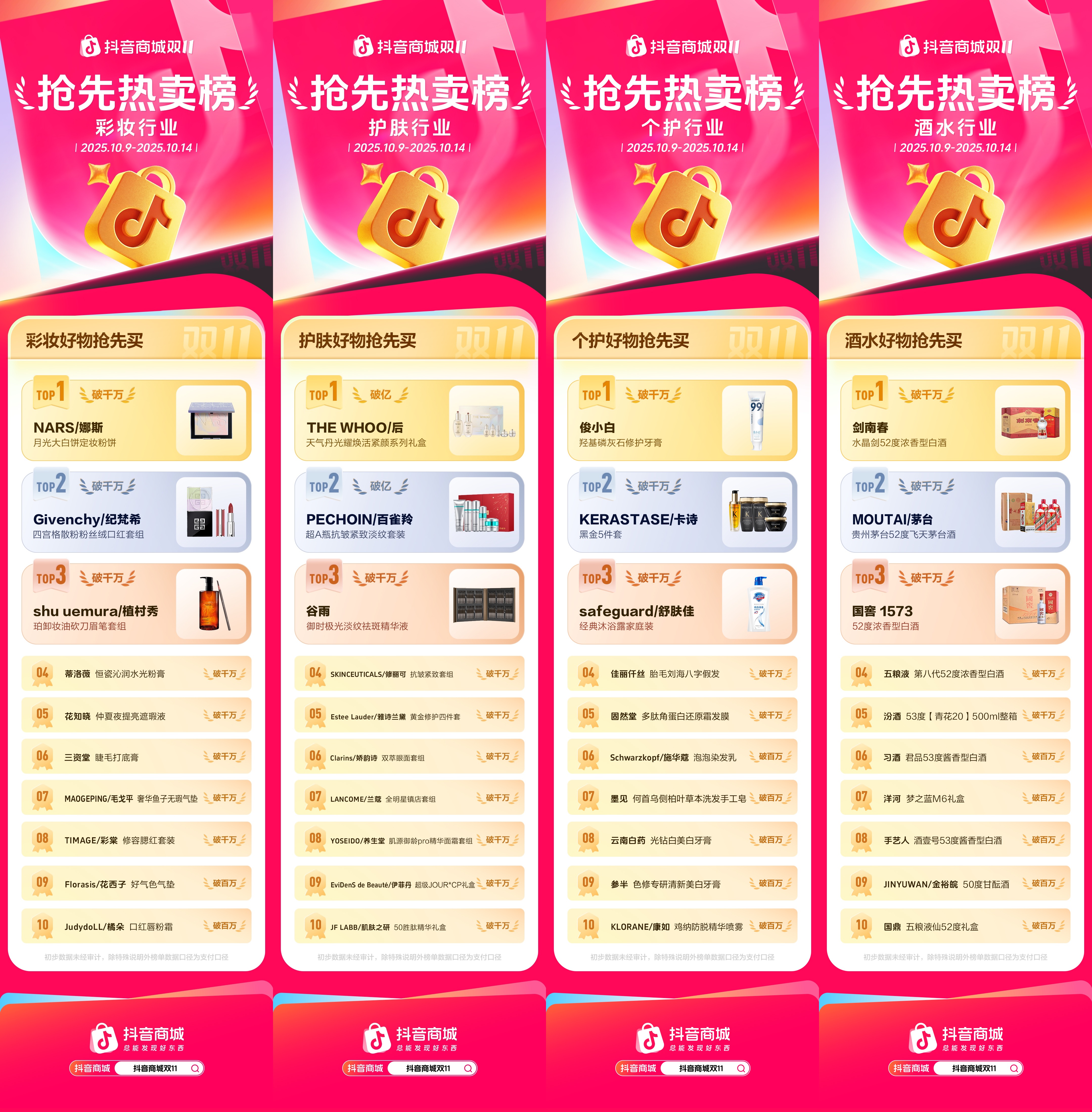 10月15日,抖音电商发布各行业双11“抢先热卖榜”,通顺户外、护肤、数码等行业泄漏爆款好物。
