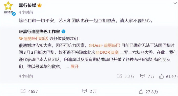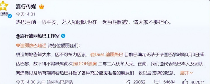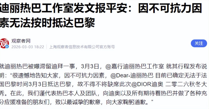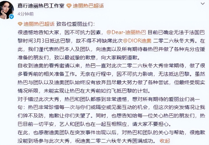 直到迪丽热巴作事室发布认真声明,明确因不成抗力导致无法按期赶赴巴黎,缺憾缺席迪奥大秀,并小心强调“艺东谈主及团队一切祥瑞,相互照顾”,这些坏话才逐渐平息。