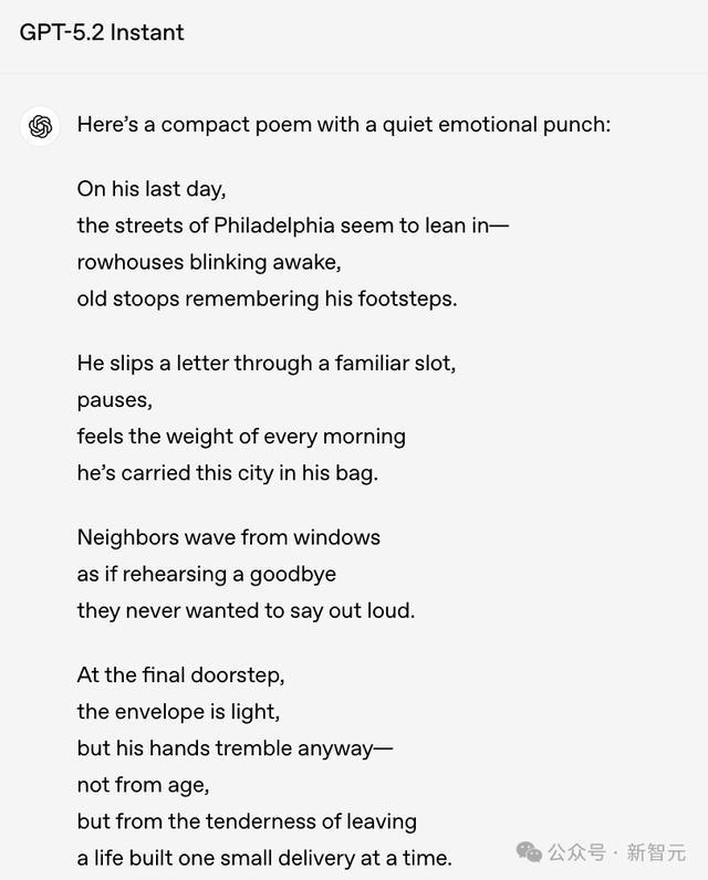 比如,让模子以「费城一位退休邮递员临了一次送信」为题,写一首短诗。