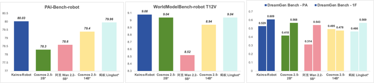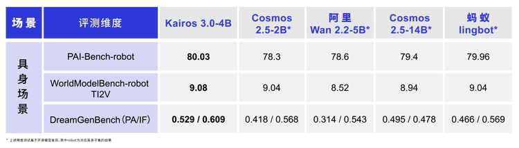Kairos 3.0-4B 以 80.03 分领跑,全面杰出 Cosmos 2.5-2B(78.3 分)、阿里 Wan 2.2-5B(78.6 分)、Cosmos 2.5-14B(79.4 分)及蚂蚁 Lingbot(79.96 分),考据了其在具身任务践诺、物理交互安稳性上的行业第一地位。
