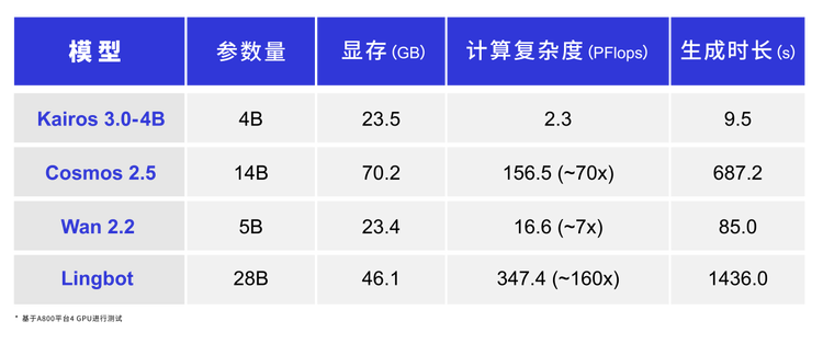 Kairos 3.0-4B 以 4B 轻量化参数竣事 23.5GB 显存占用,与 5B 的 Wan 2.2 十分,远低于 14B 的 Cosmos(70.2GB)和 28B 的 Lingbot(46.1GB),在保抓极致性能的同期,大幅缩小部署门槛,无缺适配具身智能端侧及时推理需求,冲破“大参数 = 高性能”的行业固有阐明。